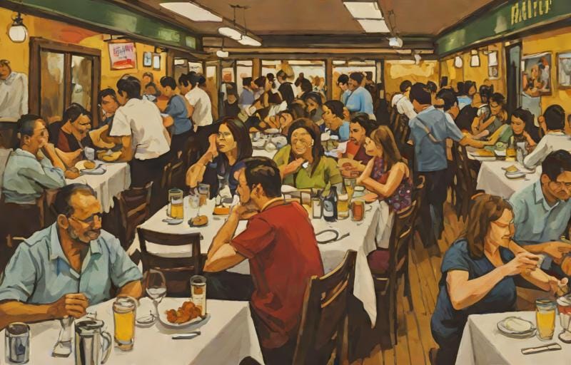 Everyone sounds phony when you’re sitting alone in the cacophony of a restaurant where you want to think thoughts of your own. You mind your own business while you mined the crowd for everyone else’s business. Alone, in this discomfort zone, you open up a trendy social media app and doom scroll on your phone. You silently thank God you no longer have any financial fears, as mosquitoes of office talk and gossip buzz around your ears. The air’s punctuated with “dude”, “bro” and “no way”s, while their banal activities ramble on for days. Talking about problems without a solution, the music and chatter stir up a batter of frenzied noise pollution. And you wonder, “am I sitting in a newfangled mental institution? Because the people in this place makes me doubt there’ll ever be another American revolution.” So you just go back to doom scrolling your phone, because everyone sounds phony when you’re sitting alone.